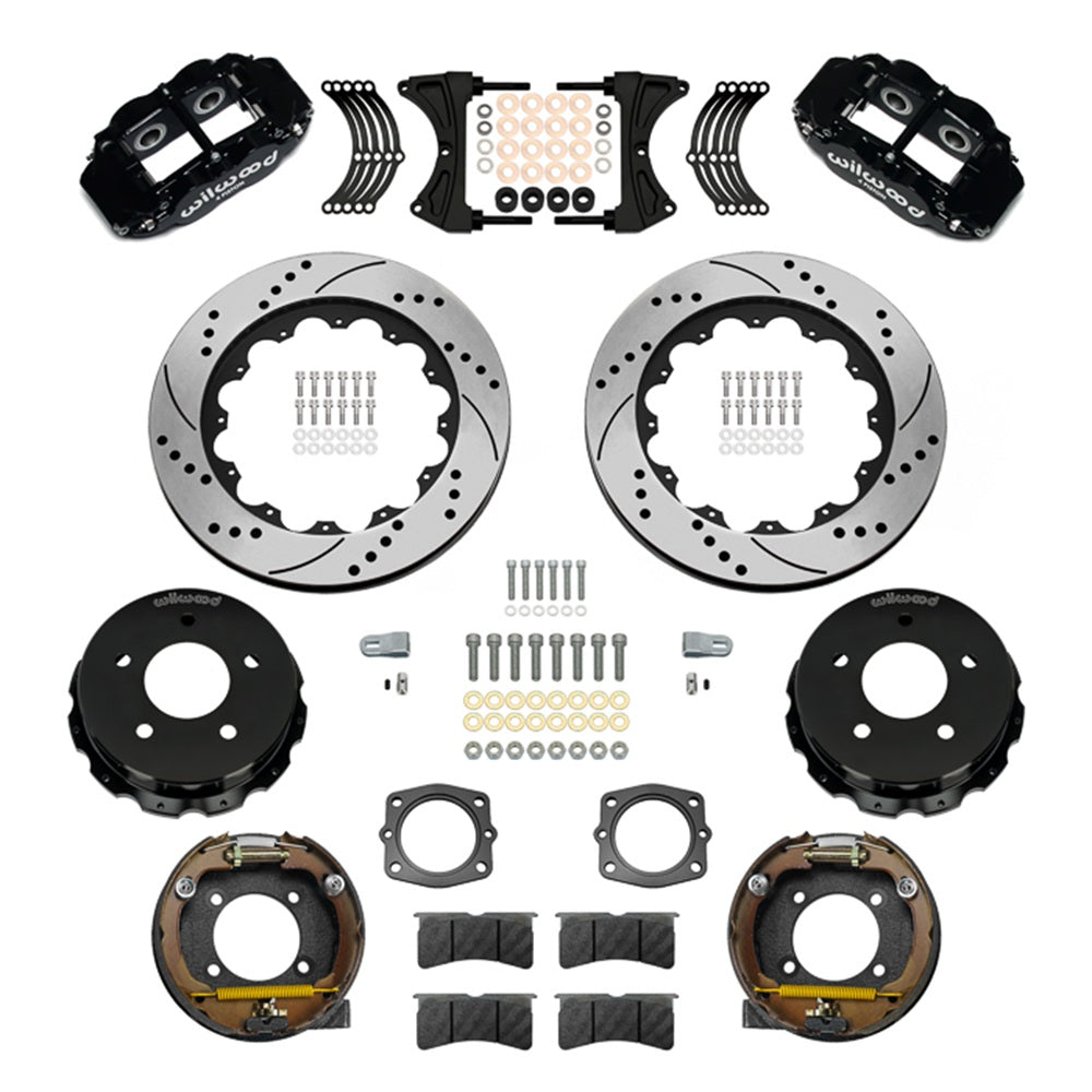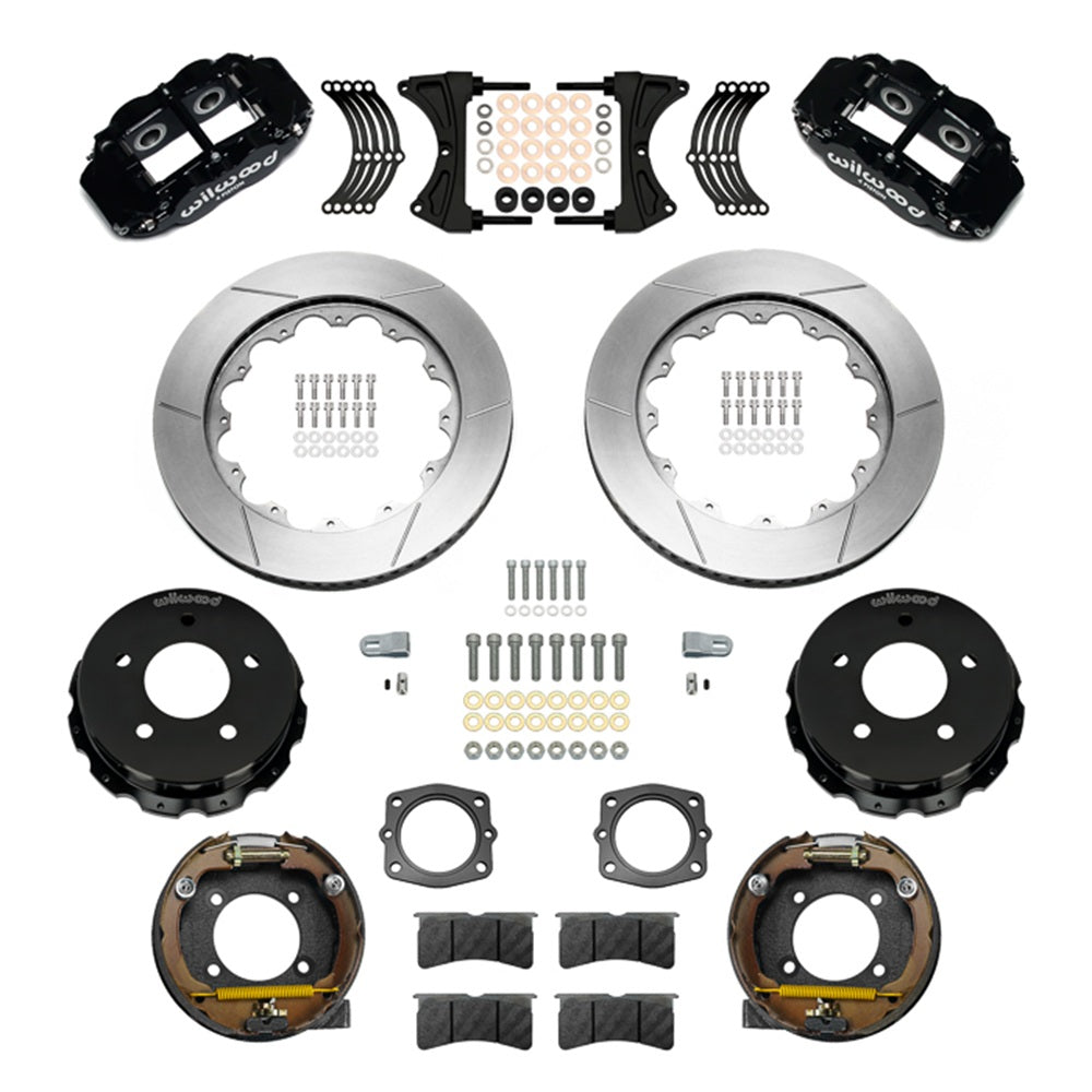 Forged Narrow Superlite 4R rear disc kits provide the ultimate Big Brake solution for popular muscle car rear axles that require a parking brake. FNSL4R four piston calipers, 13” or 14” two-piece rotors, and high performance BP-10 compound pads provide optimized and balanced braking to compliment front big brake upgrades on all types of custom, show and high performance street machines. The neatly hidden internal shoe system provides a clean installation with superior static holding power for parking. Optional caliper finishes and rotor designs allow builders to personalize the style and performance for every application.